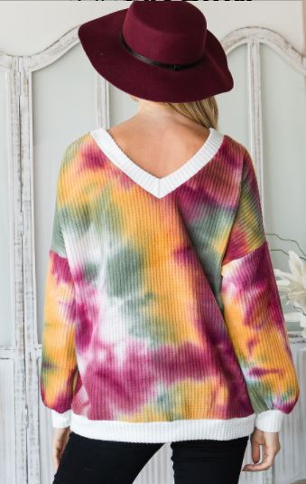 Tie dye and contrast thermal fabric top is features in a V-Neckline and long sleeves.
