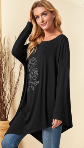 From the scoop neckline to the asymmetrical hemline, this floral rhinestone top goes with the flow. A casual look that will dress up your jeans. You don't want to miss this one!
