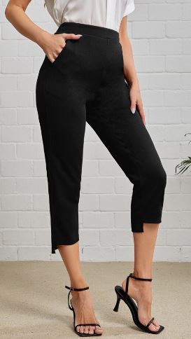 Black capri pants with a dip hem. Perfect for casual occasions!