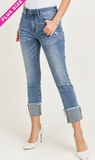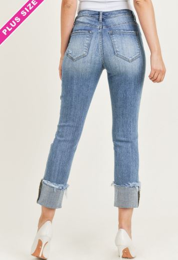MID RISE RAW HEM CUFFED SLIM STRAIGHT LEG JEANS
