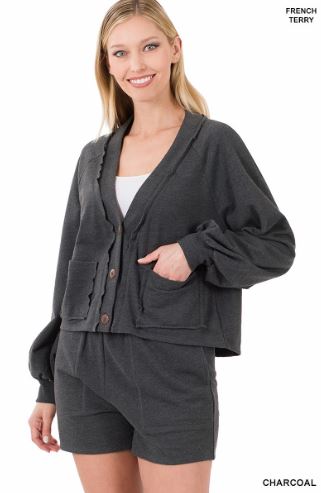 Description: French Terry Button Down Cardigan & Drawstring Waist Shorts Set