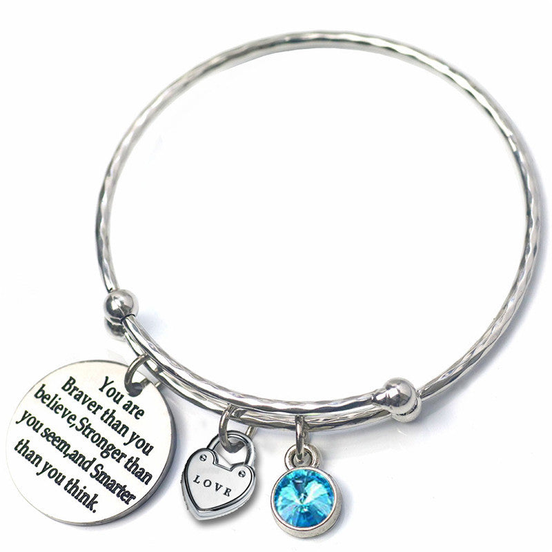 A heart and rhinestone charm hang from this titanium steel adjustable bracelet, which also has the inspirational saying, "You are braver than you believe, stronger than you seem, and smarter than you think" It's the perfect gift for any gal!!!
